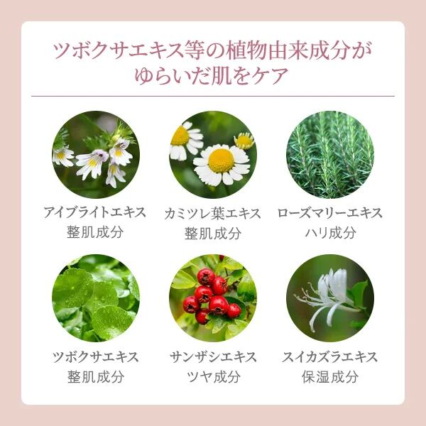 水、PG、グリセリン、ペンチレングリコール、アスパラギン酸Mg、グルコン酸亜鉛、グルコン酸銅、ツボクサエキス、アイブライトエキス、スイカズラ花エキス、カミツレ花エキス、ローズマリー葉エキス、サンザシエキス、アセチルヘキサペプチド-1、アボカド油、アンズ核油、カニナバラ果実油、ヒマワリ種子油、ベタイン、アスコルビルグルコシド、グリチルリチン酸2K、ヒアルロン酸Na、加水分解ヒアルロン酸、加水分解コラーゲン、加水分解エラスチン、トコフェロール、ナットウガム、カルボマー、水酸化K、BG、PPG-6デシルテトラデセス-30、1,2-ヘキサンジオール、EDTA-2Na、フェノキシエタノール、エタノール、香料